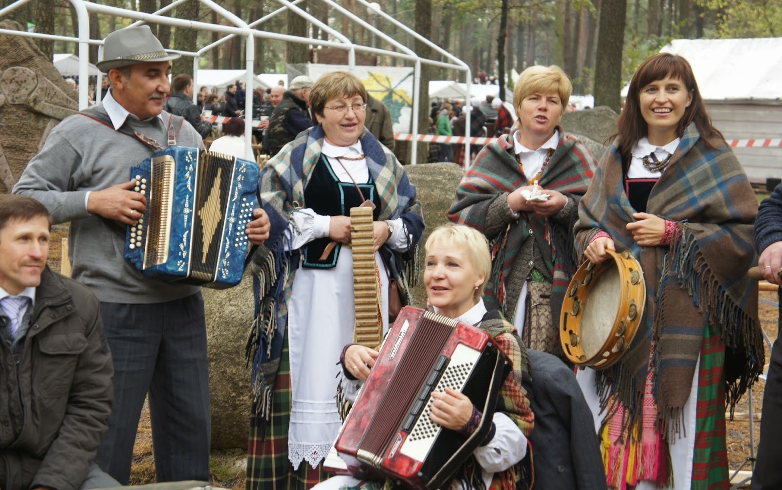 The festival itself was very much a continuation of my train adventure.Mushrooms, red and yellow autumn leaves, and various squash types ornamented the park. Folk artists proudly displayed their hand-crafted souvenirs, intricate weavings, and unique pottery designs. Costumed men and women sat behind small tables, superfluous with baked goods, vegetables, mushroom, and potato dishes. On stage, children sang and danced. Offstage, they participated in old traditional games and sporting activities. Adults, meanwhile, partook in the multitudinous beer and wine tastings. Throngs formed around the woodcarving exhibition, where people could purchase original creations made from the local artists. Others still watched as the local townspeople demonstrated their crafts: spinning and weaving and woodworking. Robert Silberstein, the U.S. Embassy's Deputy Chief of Mission (DCM), even gave a short speech and was honored with a basket of Varėna's famous mushrooms!